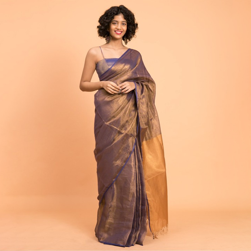 Purple & Gold-Toned Zari Pure Linen Saree