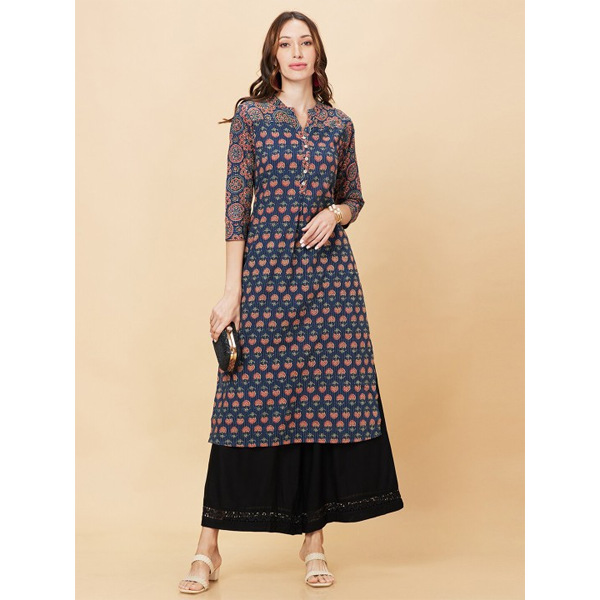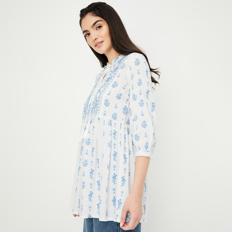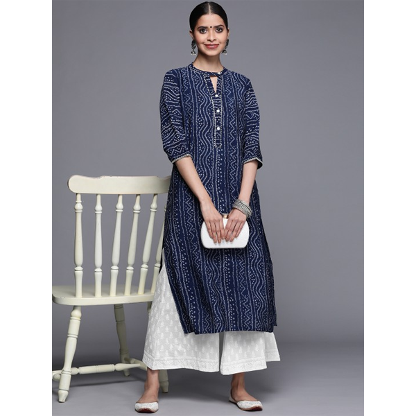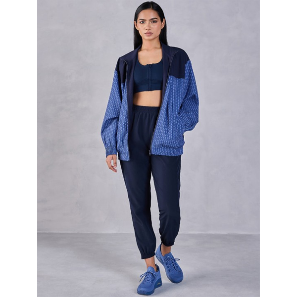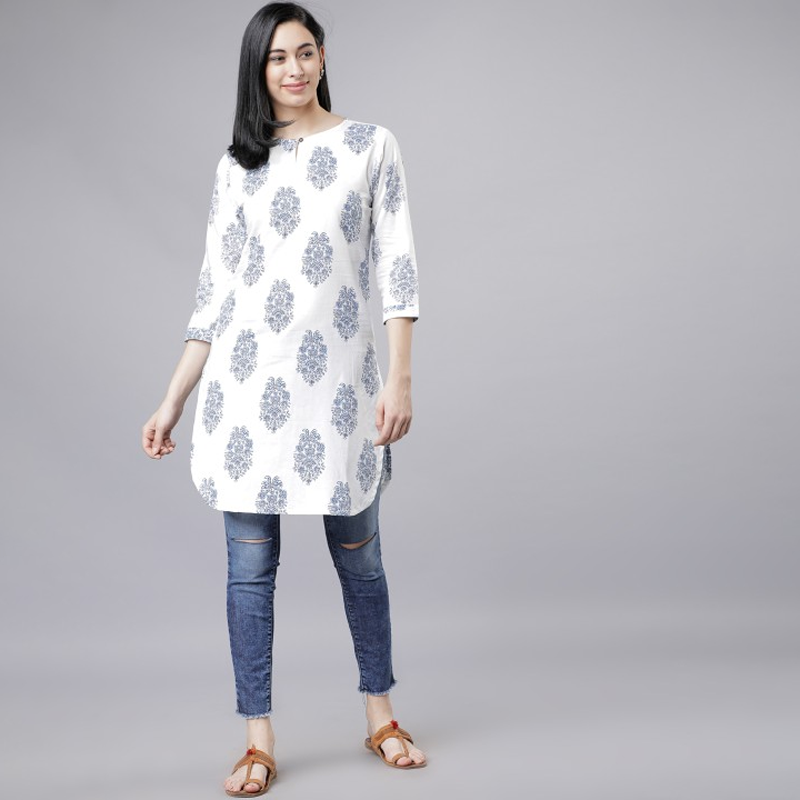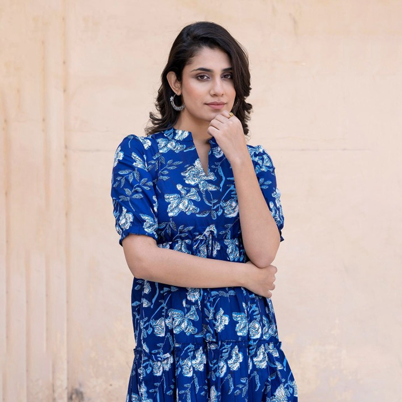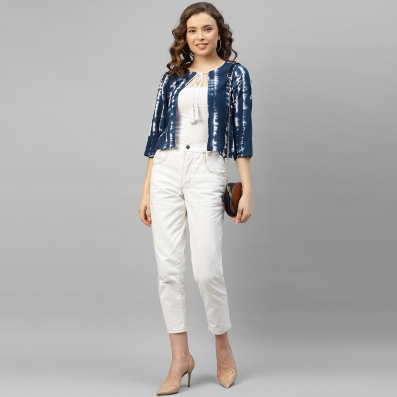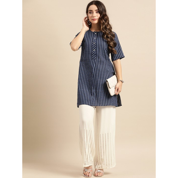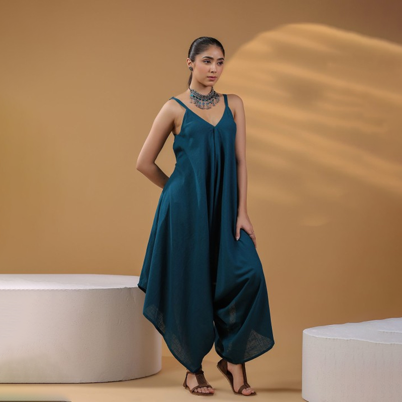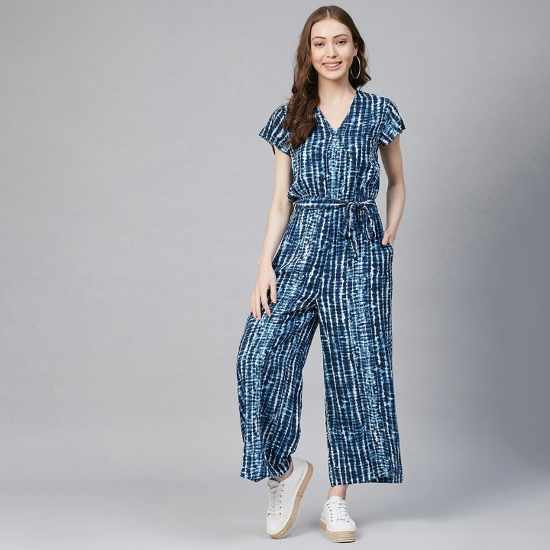 Navy blue and white printed basic jumpsuit ,has a boat neck, three-quarter sleeves, 2 pockets Size & Fit The model (height 5'8) is wearing a size S Material & Care Viscose Rayon Machin wash