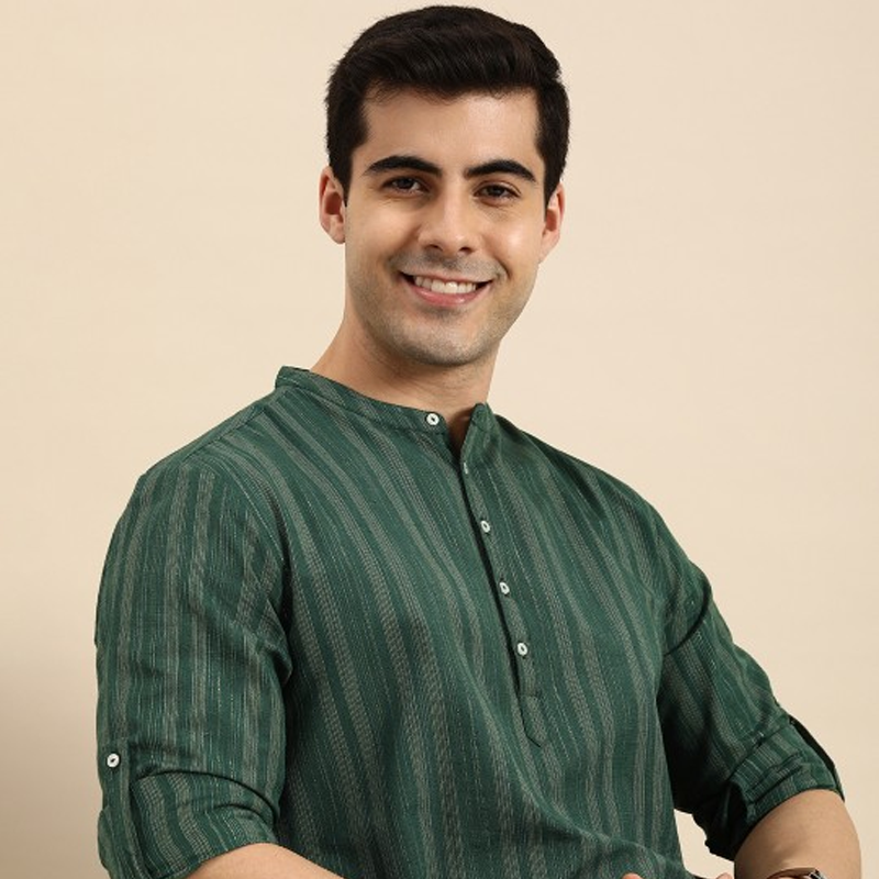 Men Green & Gold-Toned Striped Mandarin-Collar Kurta